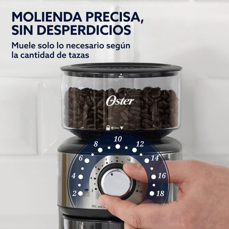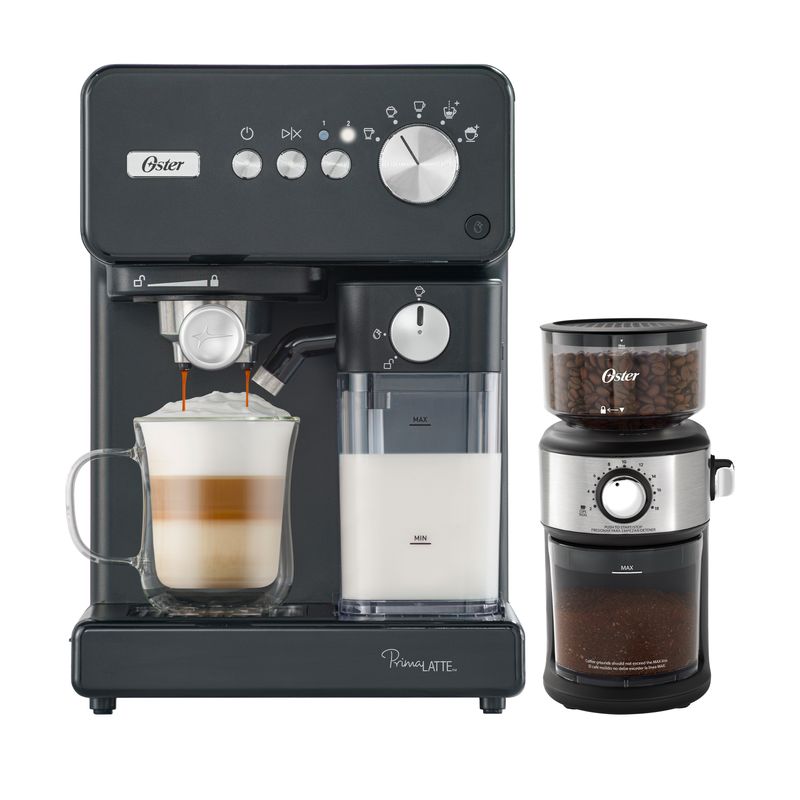 Kit Cafetera Oster® Espresso, PrimaLatte, Color Negro, BVSTEM6604BK y Molinillo de Café Oster® de Muelas, BVSTBMH24